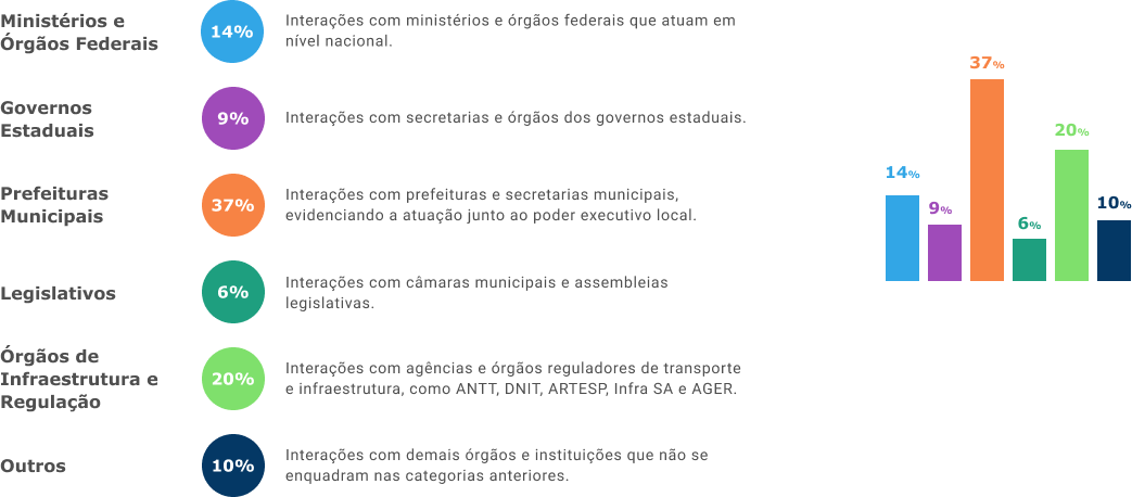 Reflete o percentual de interações da Rumo, distribuídas entre os órgãos públicos