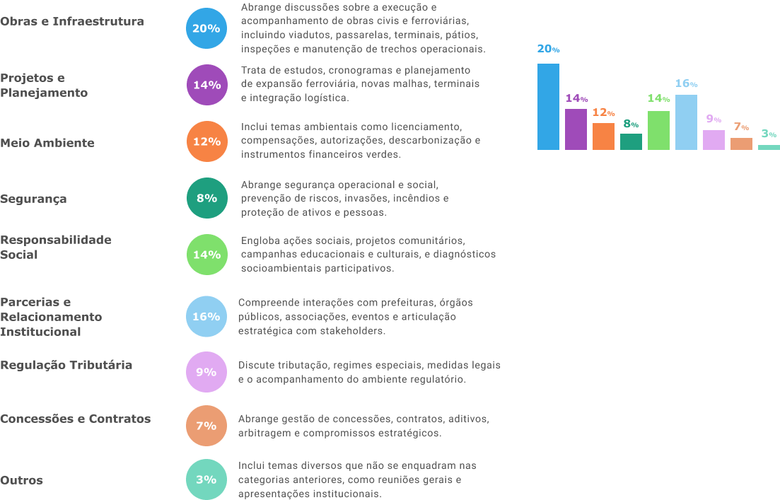 Reflete os assuntos mais recorrentes nas reuniões e seus impactos na operação e na estratégia da Rumo: